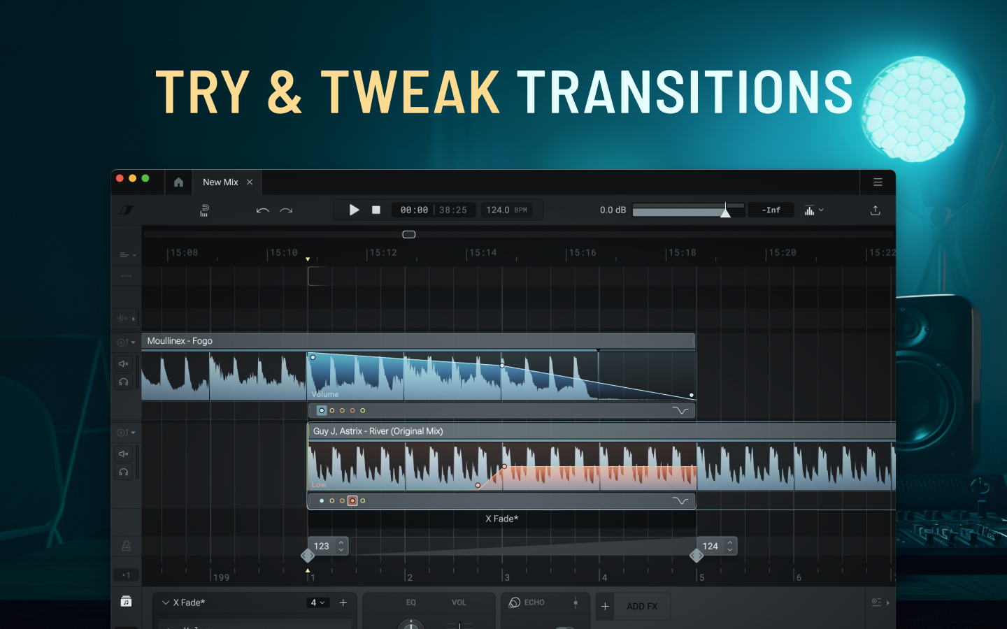 • Auto-mixing — quickly build mixes using playlists, default transition lengths, and templates
